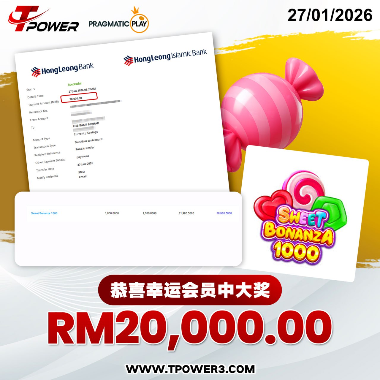 🎉 Congratulations to the member for winning RM20,000.00 in Pragmatic Play's SWEET BONANZA 1000 ! 🔥 TPOWER never ceases to amaze 😍